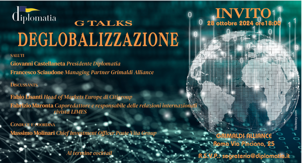 Siamo lieti di ospitare l’evento “Deglobalizzazione”, promosso dall’Associazione Diplomatia, in data 28 ottobre 2024, nella nostra sede di Roma.